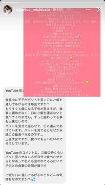フォロワーからの質問は、この動画を踏まえてのものだった。質問者は、動画のコメント欄に「ご飯の時くらいパット見させない方が」との声があったとして、自分も責められているように感じた、などと悩みをつづっている。