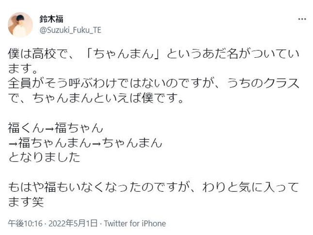 さらに数時間後、「僕は高校で、『ちゃんまん』というあだ名がついています」とクイズの答えを明かしつつ、「全員がそう呼ぶわけではないのですが、うちのクラスで、ちゃんまんといえば僕です」とつづった。そして「福くん→福ちゃん→福ちゃんまん→ちゃんまんとなりました」とあだ名の由来を説明し、「もはや福もいなくなったのですが、わりと気に入ってます笑」と好意を示した。