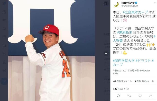 「投げた広島のピッチャー黒原拓未くん 去年広島のドラフト1位で入団した選手だ。その彼のSNSとやらに吉川に当てたことに対して責めるコメントを送っている方がいると聞いた。本当かね?」と疑問を投げかけつつ「送る主は巨人ファンだろうか」と続けた。