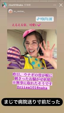 仲さんがアップしたのは、妹の「れいちゃん」の投稿を引用したもの。4月に始まった番組「えるえる」(NHK Eテレ)に登場する妖精のキャラクター「えるえる」に扮した仲さんの写真に、「えるえる姿、可愛い」のメッセージを添え、「昨日、ウナギの骨が喉に刺さったお騒がせ妖精 ※無事に取れたそうです」と驚きのエピソードを紹介している。この投稿に仲さんが「まじで病院送り寸前だった」のコメントを添えてストーリーを更新した。