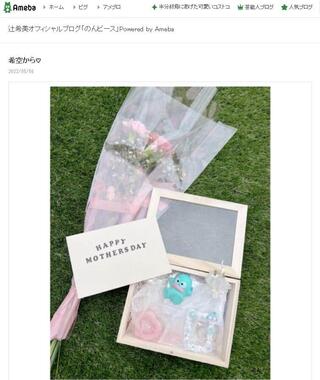 辻さんは「希空から」というタイトルのブログ記事を投稿し、「母の日の贈り物頂きました」と報告。公開した写真には花束とキャラクターのキーホルダー、「HAPPY MOTHERS DAY」と記されたメッセージカードが写っており、その内容に「涙しか出ん」と感慨深そうにつづっていた。
