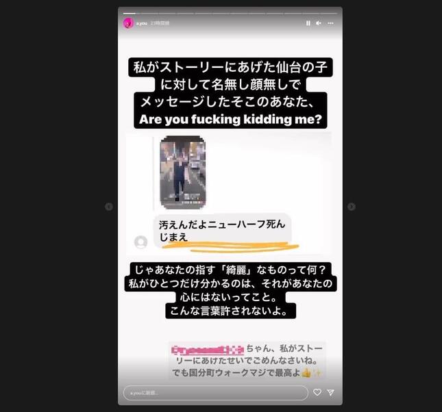 「私がストーリーにあげた仙台の子に対して名無し顔なしでメッセージしたそこのあなた、Are you fucking kidding me?(編訳・ふざけてるの?)」