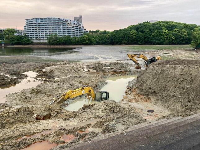 名古屋市千種区内の平和公園にある池で、パワーショベル3台が水没するなどした様子を撮った写真がツイッターに投稿され、何があったのかと話題になっている。