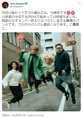 ロックバンド「ゲスの極み乙女。」のボーカル・川谷絵音さん(33)が2022年5月12日、ツイッターを更新し、バンドが結成10周年を迎えたと報告した。