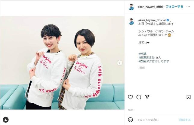 早見さんが公開したのは、「シン・ウルトラマン」と書かれた白いパーカーを着た2ショット写真。早見さんは、「本日『VS魂』に出演します シン・ウルトラマンチーム みんなで頑張りました 見てね」とメッセージを添えている。