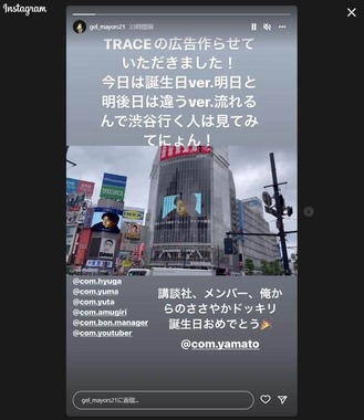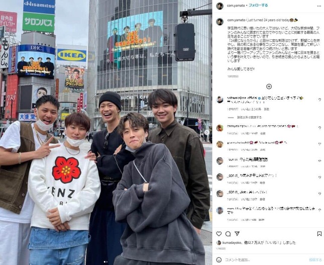 インスタグラムにはメンバーとの集合写真を公開。写真は渋谷スクランブル交差点で撮影されたものだったが、そのバックの大型ビジョンには「5.15 やまと誕生日おめでとう!」と記されたムービーが流れている。