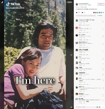 やまとさんが「My name is YAMATO」のメッセージとともにアップしたのは、両親の若い頃の写真と現在のやまとさんの写真を繋いで作られた動画。「PAPA」のテロップのあとにはタバコを吸う若かりし頃の父親、「MAMA」のテロップのあとには笑顔で頭を押さえる母親のワンショットが登場。「I'm here」のテロップとともに寄り添い合う夫婦の2ショット写真が現れ、やまとさんの1ショットが3枚続く。