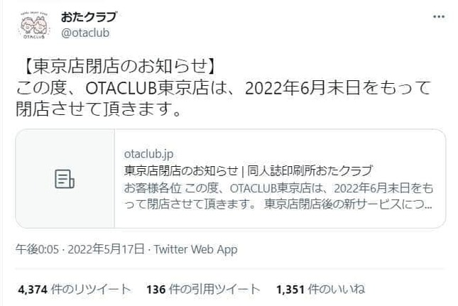 同社は同人誌の印刷を主軸とする。発表によれば、東京支店「OTACLUB東京店」を6月末で閉店する。大阪本社に従業員や印刷機材などを集約し、7月上旬に形態を一部変えてサービス再開を目指す。