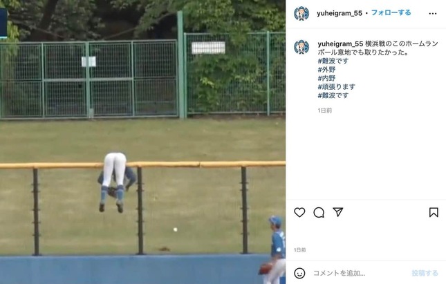難波選手は16日、同場面の写真を添付しながら、「横浜戦のこのホームランボール意地でも取りたかった」とインスタグラムで伝えている。