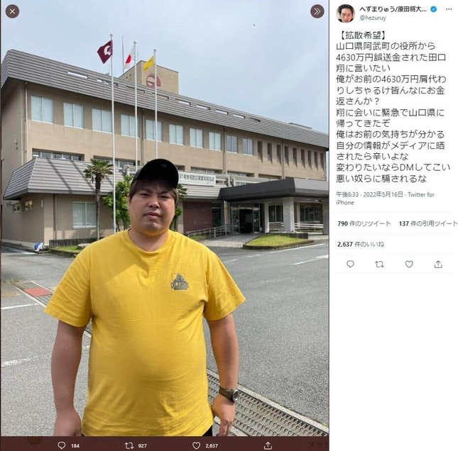 へずまさんは16日、阿武町役場前で撮影した写真を添え「山口県阿武町の役所から4630万円誤送金された○○(編集部伏字、原文は男性の実名、以下同)に言いたい」とし「俺がお前の4630万円肩代わりしちゃるけ皆んなにお金返さんか?」と自身が肩代わりすると宣言し、町にお金を返還するよう呼びかけた。男性と同じ山口県出身のへずまさんは、男性に会うため山口県に帰ってきたとしている。