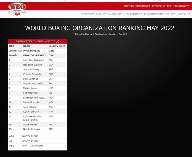 プロボクシングの世界王座承認団体WBO(世界ボクシング機構)は2022年5月19日までに世界ランキングを更新し、前WBO世界バンタム級王者ジョンリル・カシメロ(フィリピン、32)が同級1位にランクインした。