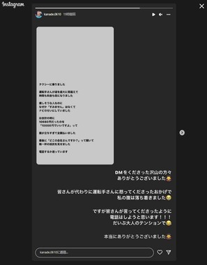 お笑いトリオ・3時のヒロインのかなでさんが、2022年5月19日に自身のインスタグラムストーリーズを更新し、タクシーで遭遇したトラブルについて告白した。