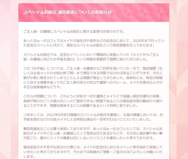 こうしたトラブルについて、運営側とメイドが協議を重ねた結果、同カフェは、座席数や感染症対策の兼ね合いから、「問題を解消することは困難であるという判断に至りました」と報告。5月末日開催のスペシャルお給仕を最後に、この「お手紙」の特別演出を取りやめると発表した。