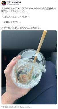 サワさんは2022年5月16日、「スタバのキャラメルフラペチーノの中に食品品質保持剤が入ってたんだけど、、、」とツイッターに投稿した。プラスチック容器の底に異物が混入している写真も共に公開している。異物には「口に入れないでください」と表記があったという。