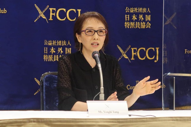 日本外国特派員協会で記者会見するヤン・ヨンヒ監督。最新作「スープとイデオロギー」が6月11日に公開される