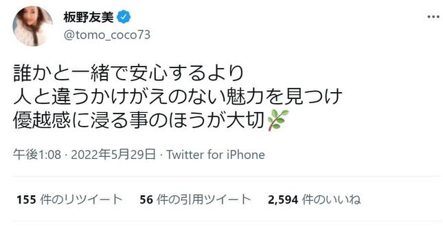 元AKB48の板野友美さんが2022年5月29日、ツイッターに投稿した言葉に様々な意見があがっている。