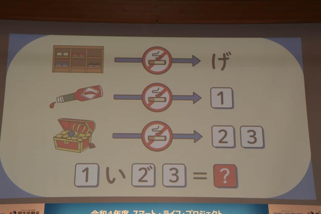 今回のイベントは若年層の禁煙や受動喫煙のリスクをテーマにしている。松丸さんは禁煙・健康をテーマに謎解きを出題。13 年から「いきいき健康大使」として活動する平原さんと、国立研究開発法人国立がん研究センターの若尾文彦さん、厚生労働省健康局健康課長の佐々木孝冶さんが挑戦した。