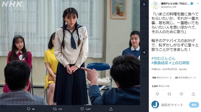 暢子のアドバイスのおかげで、恥ずかしがらずに堂々と歌うことができました!#ちむどんどん#黒島結菜 #上白石萌歌 pic.twitter.com/delzjn9EPF