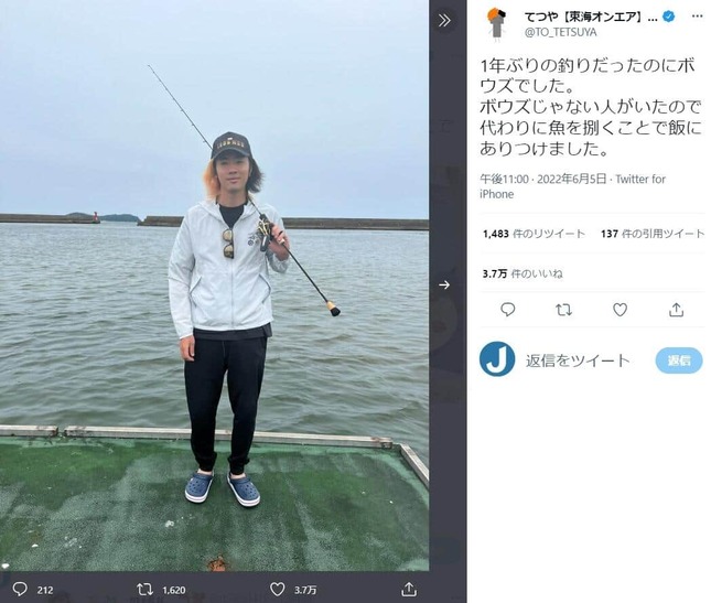 このツイートから13分後の23時、てつやさんが「1年ぶりの釣りだったのにボウズでした。ボウズじゃない人がいたので代わりに魚を捌くことで飯にありつけました」とツイート。釣り竿を担ぐ写真は峯岸さんと同じ白いパーカーを着用し、鯛を捌く写真もアップしている。