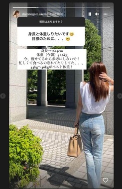 ダレノガレさんは、ファンからの「身長と体重しりたいです 目標のために、、、」という質問に答える形でストーリーズを投稿。白いカットソーとデニムの後ろ姿の写真とともに、「身長→161.5cm 体重(今朝)42.6kg」と詳細に答えた。写真は2日にインスタグラムにアップしていた私服ショットだ。ダレノガレさんは続けて、「今、痩せてるから参考にしないで!忙しくて食べるの忘れてたりしてた、、、 44kg~46kgがベスト体重!」と付け加えた。