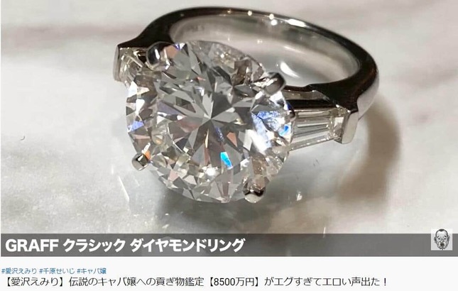 愛沢さんによると、6000万円のリングをプレゼントしてくれた客は「おもしろい人」とのこと。関係について聞かれると「お任せします、ご想像に」と誤魔化しつつ、「大切な人にいただきました」と明かし、「キラキラの」とおねだりした結果、プレゼントしてもらったと明かした。