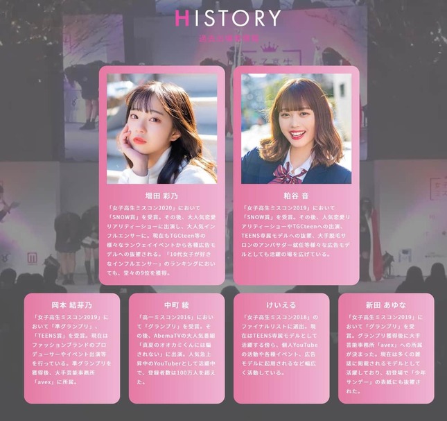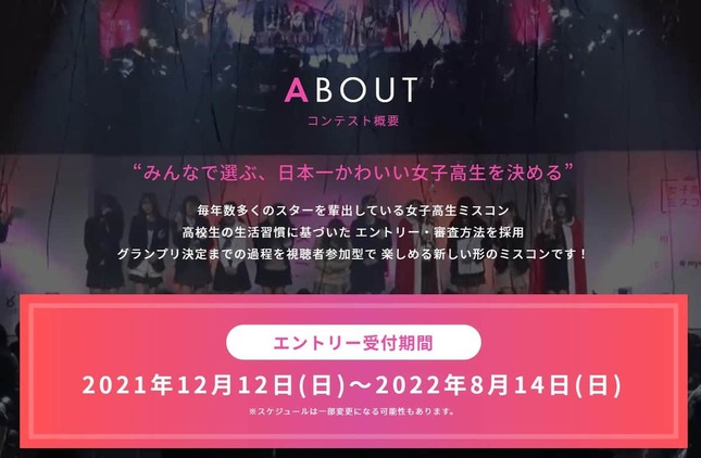 女子高生ミスコンは今年で8回目となる。スポンサーを写真加工アプリの「SNOW」、着物レンタルの「ジョイフル恵利」、衣料販売の「SPINNS」が務め、メディアパートナーの「モデルプレス」は、「近年"芸能界の登竜門"としても話題」と喧伝している。