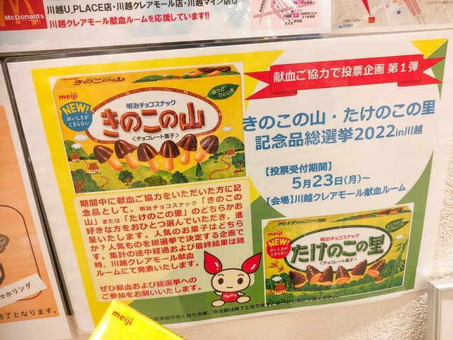 「まさに血を見る争い」――。埼玉県内の献血会場が、献血の協力品として明治のお菓子「きのこの山」「たけのこの里」を配布し、いずれかに投票を呼びかける企画がツイッター上で話題を集めた。
