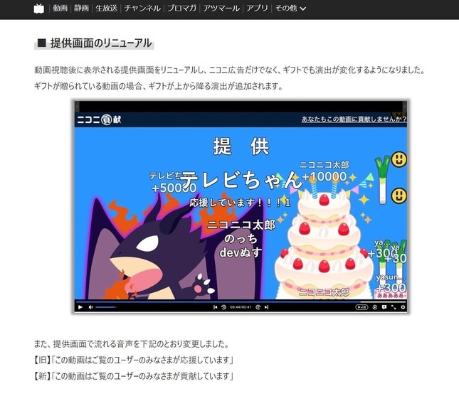 提供画面で流れる音声も変更した。従来の提供画面では、「この動画はご覧のユーザーのみなさまが応援しています」という音声が流れていたが、「この動画はご覧のユーザーのみなさまが貢献しています」に変更した。声質も異なり、以前よりやや高いものになった。