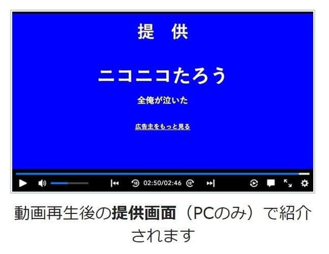 ニコニコ動画では、動画視聴後に約8秒の「提供」画面が流れる。仮装通貨「ニコニコポイント」を支払い、動画の広告を出したユーザーを紹介する機能だ。提供と書かれたブルーバックの背景に、ユーザーの名前やコメントが表示される。