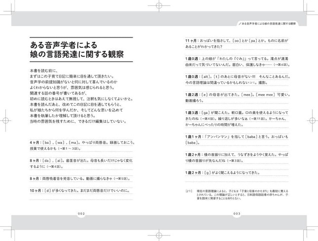 日記は、書籍「音声学者、娘とことばの不思議に飛び込む」の冒頭に掲載されている。音声学の入門書で、著者の育児経験を基に執筆された。