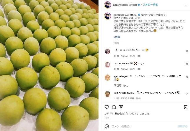 「梅仕事。今年も無事に終わりました。2017年から毎年4~5キロの梅で梅酒や梅ジュースを作っているけれど、ヘタ取り作業はやはり楽しいな」と、多数の梅の実が詰まった大型の瓶4本の写真と共に、2017年からの年中行事を報告した佐々木さん。次の投稿では、整然と並んだおびただしい数の梅の実の写真をアップしつつ、