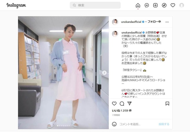 神田さんはインスタグラムで、22年8月5日公開の映画「怪奇タクシー」に出演することを報告。「少しお邪魔(特別出演)させて頂いた時のナース姿のUNO」とし、薄ピンク色のナース服に青いカーディガンを羽織った姿を披露した。