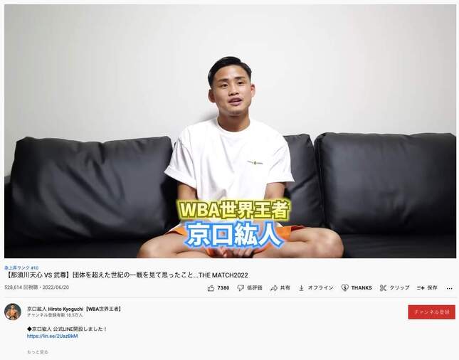 2022年6月19日に行われた格闘技イベント「Yogibo presents THE MATCH 2022」(東京ドーム)のメインマッチである那須川天心(23)と武尊(30)の試合について、プロボクシングWBA世界ライトフライ級スーパー王者・京口紘人(28)は6月20日、自身の公式YouTubeチャンネルに公開した動画で、天心が武尊に比べて「2枚ぐらい上手でしたね」と振り返った。