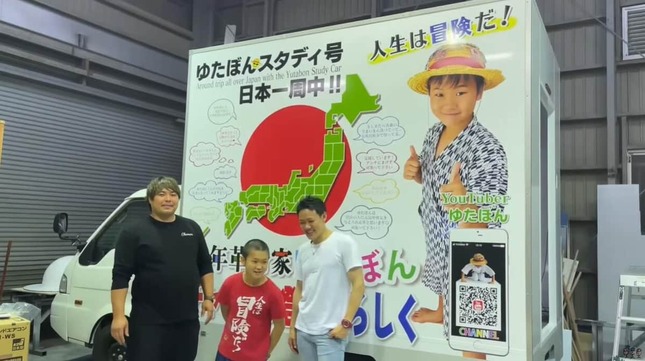 お披露目された「スタディ号」はトラックで、荷台にはサンドバックやボクシンググローブを搭載。8時間半かけてトラック荷台部分の横面に巨大ポスターを貼ったり、ゆたぼんのトレードマークである麦わら帽子型の飾りを紹介したりする様子などが公開された。