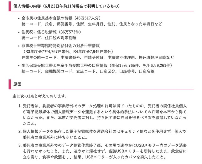 USBメモリーにはパスワードを設定しているうえ、内容は暗号化処理が施されているという。23日15時時点で「第三者への個人情報漏洩および不正使用などの事実は確認されておりません」。