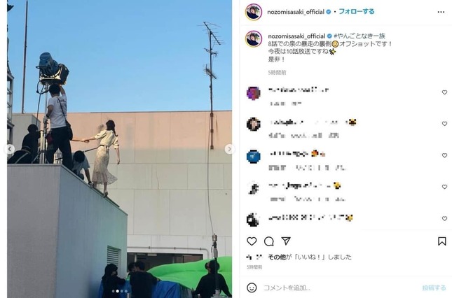 写真には佐々木さんからの「8話での泉の暴走の裏側 オフショットです!」というメッセージが添えられている。佐々木さんは「やんごとなき一族」で、松下洸平さん(35)演じる深山健太の秘書・立花泉役で出演しており、第8話には泉と健太がビルから転落する直前のシーンがあった。