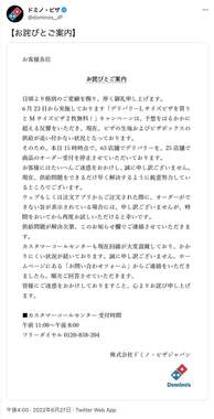 ドミノ・ピザは6月27日にツイッターの公式アカウントの書き込みで、「現在、ピザの生地およびピザボックスの供給が追いつかない状況となっております」とし、「本日15時時点で、63店舗でデリバリーを、25店舗で商品のオーダー受付を停止させていただいております」と報告。その上で「お客様にはたいへんご迷惑をおかけし、誠に申し訳ございません」と謝罪した。