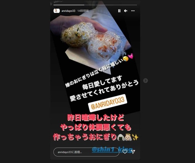 坂口さんは30日、進一さんの投稿を引用する形でストーリーを更新。2種類のおにぎりの写真を背景に「嫁のおにぎりは泣く程に嬉しい 毎日愛してます 愛させてくれてありがとう」とする進一さんのコメントに、