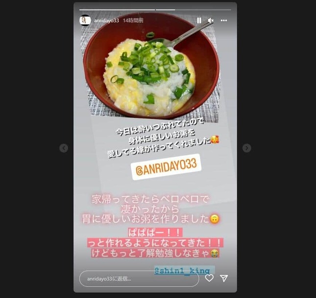 続く投稿では、「今日は酔いつぶれてたので 身体に優しいお粥を 愛してる嫁が作ってくれました」とする進一さんの投稿を引用し、「家帰ってきたらベロベロで凄かったから 胃に優しいお粥を作りました ぱぱぱー!! っと作れるようになってきた!! けどもっと了解勉強しなきゃ」(原文ママ)としている。