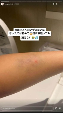一方、ストーリーズでは、搬送後の点滴による痛々しいアザの跡を公開。「点滴でこんなアザみたいになったのは初めて」「アザがどんどん酷くなってて」と明かした。また、自身の元に寄せられた「自分が悪いのに救急車呼んだんですか?」といった指摘を引用し、「責められるDMも多いけど優しいメッセージのおかげで乗り越えられてます!!ありがとうございます」とファンに感謝をつづっていた。