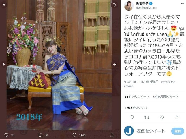 続けて、「最後にタイに行ったのは臨月妊婦だった2018年の5月?と思いきやカメラロール見たらコロナ前の2019年秋にも弾丸旅行してました」と投稿。「民族衣装の写真は産前産後のビフォーアフターです」として、妊娠中の2018年に撮影した写真と、産後の19年に撮影した写真をそれぞれ公開した。