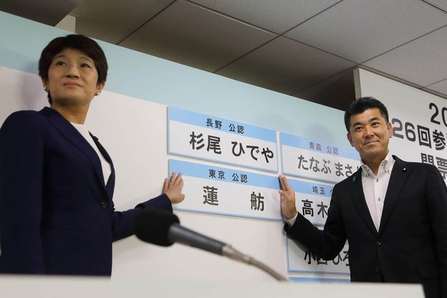 • 当選確実になった候補者のボードを貼り付ける立憲民主党の西村智奈美幹事長(左)と泉健太代表(右)