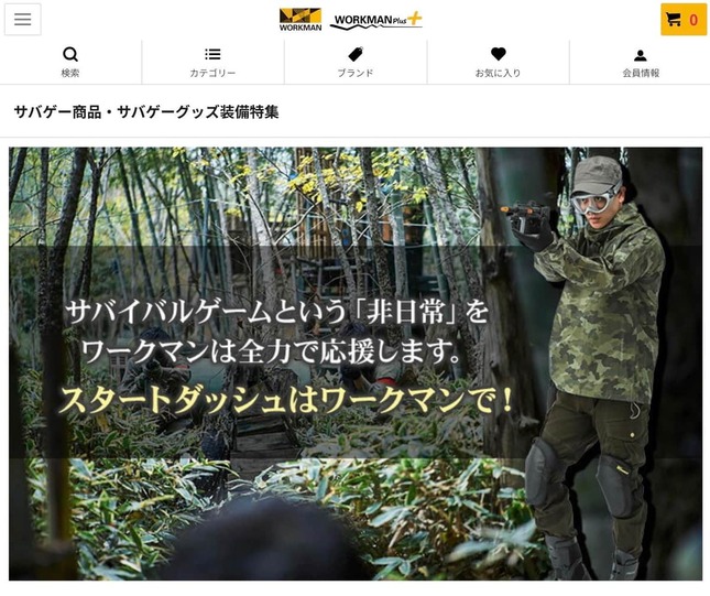 投稿では、ワークマンオンラインストアの「サバゲー商品・サバゲーグッズ装備特集」というページが紹介されている。同ページでは、迷彩服やゴーグルを着用した「サバゲー装備」の男性の写真ともに、こんなキャッチコピーが躍っている。