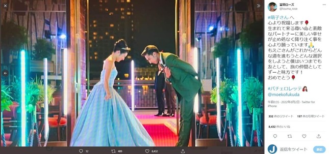 また、ローズさんは同日にツイッターも更新。『バチェロレッテ』での福田さんと自身のワンシーンを捉えた画像を投稿し、「もえこさんがこれからどんな道を進もうとどんな選択をしようと僕はいつまでも友として、旅の仲間としてずーと味方です!おめでとう」とつづっていた。