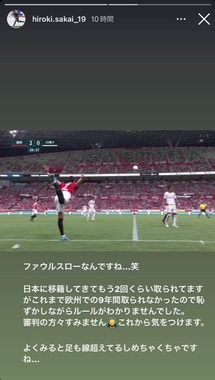 酒井選手が言及したのは、7月30日のJ1第23節・川崎フロンターレ戦前半35分のシーン。試合に出場していた酒井選手はこの時スローインを行ったが、ファウルスローと判定されて川崎ボールに変わった。ストーリーに投稿されたのは、この時の自身の姿を後ろから撮影した映像だったが、その姿は右足を後方に大きく突き出しながら左足1本で立ち、スローインするというものだった。