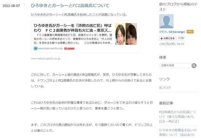 川上氏はその後のブログで、ひろゆき氏の賠償金未払いの「真相」や、FC2との訴訟の見解について長文で書きとめている。
