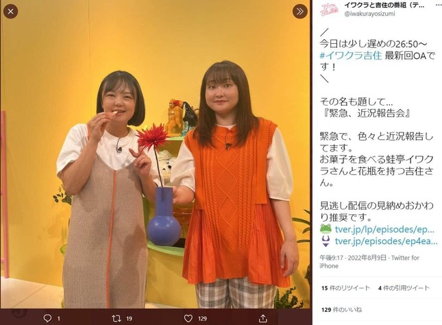 この日の放送は、「緊急、近況報告会。」と題して、吉住さんとイワクラさんの2人がゲストなしでガールズトークを展開した。