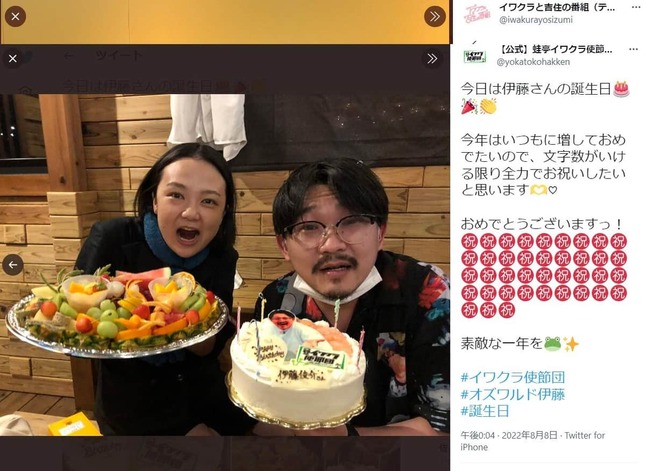 イワクラさんは、お笑いコンビ「オズワルド」の伊藤俊介さん(33)との交際を公表している。