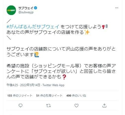 サブウェイの公式ツイッターは22年5月14日、こんな投稿を行った。駅ビルやショッピングモールなど、サブウェイが新しく出店してほしい場所をツイッターユーザーから募ることで、FCオーナーに出店の参考にしてもらおうというものだ。