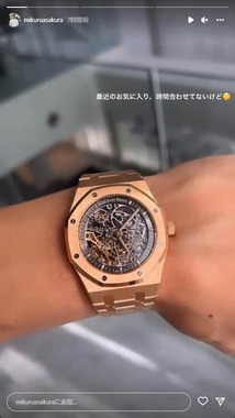 「最近のお気に入り、時間合わせてないけど」のコメントと共に朝倉さんがインスタグラムのストーリで公開したのは、スイスの高級ブランド「オーデマ ピゲ」の腕時計を左腕に着用している写真だ。